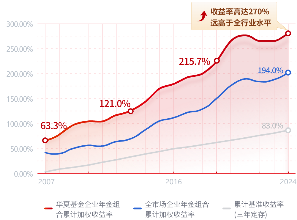 拥有经验丰富的年金投资团队,平均从业年限 超14年 。追求长期稳健的投资收益,严格控制各类投资风险。2007-2024年末,公司管理的企业年金整体累计加权收益率达 270% ,远高于全行业水平的194%。