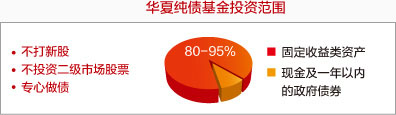 | 1、华夏纯债债券基金,强调纯粹的债券投资,不以任何形式参与股票类资产,不受股票市场波动影响,适合追求绝对正回报的投资者。 |