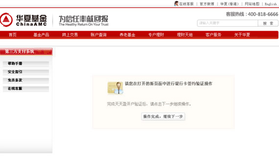 5、银行验证成功后,请在网上交易开户页面点击“操作完成,继续下一步”按钮进入基金公司签约页面。