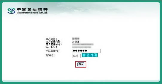 3、选择“民生银行”作为您的开户银行后,民生银行将弹出银行卡验证页面,您在弹出页面上输入银行卡密码,并输入附加码,点击“确定”。
