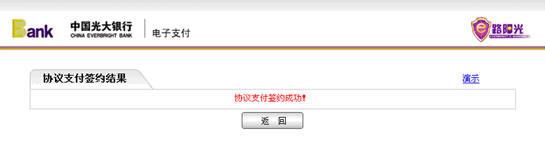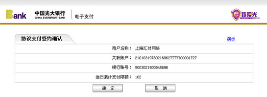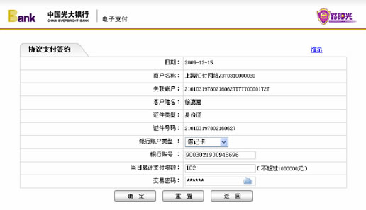 3、选择“光大银行”作为您的开户银行后,光大银行将弹出协议支付签约页面,请输入银行卡号、当日累计支付限额和交易密码,点击“确定”按钮。