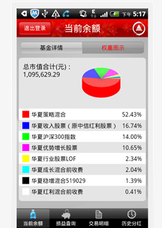 实时查询个人名下基金账户的当前余额,以及各基金在总投资中所占比例 |