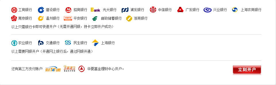 华夏网上交易最优惠的银行卡(申购最低4折)的是绑定:工行、农行、民生银行、浦发银行、中信银行、广发银行、光大银行、兴业银行、上海农商银行、温州银行、南京银行、浙商银行、平安银行、邮储银行、上海银行的银行卡以及天天盈、财付通。(银联卡:兴业、中信、上海农商、南京银行有单笔转账费。)